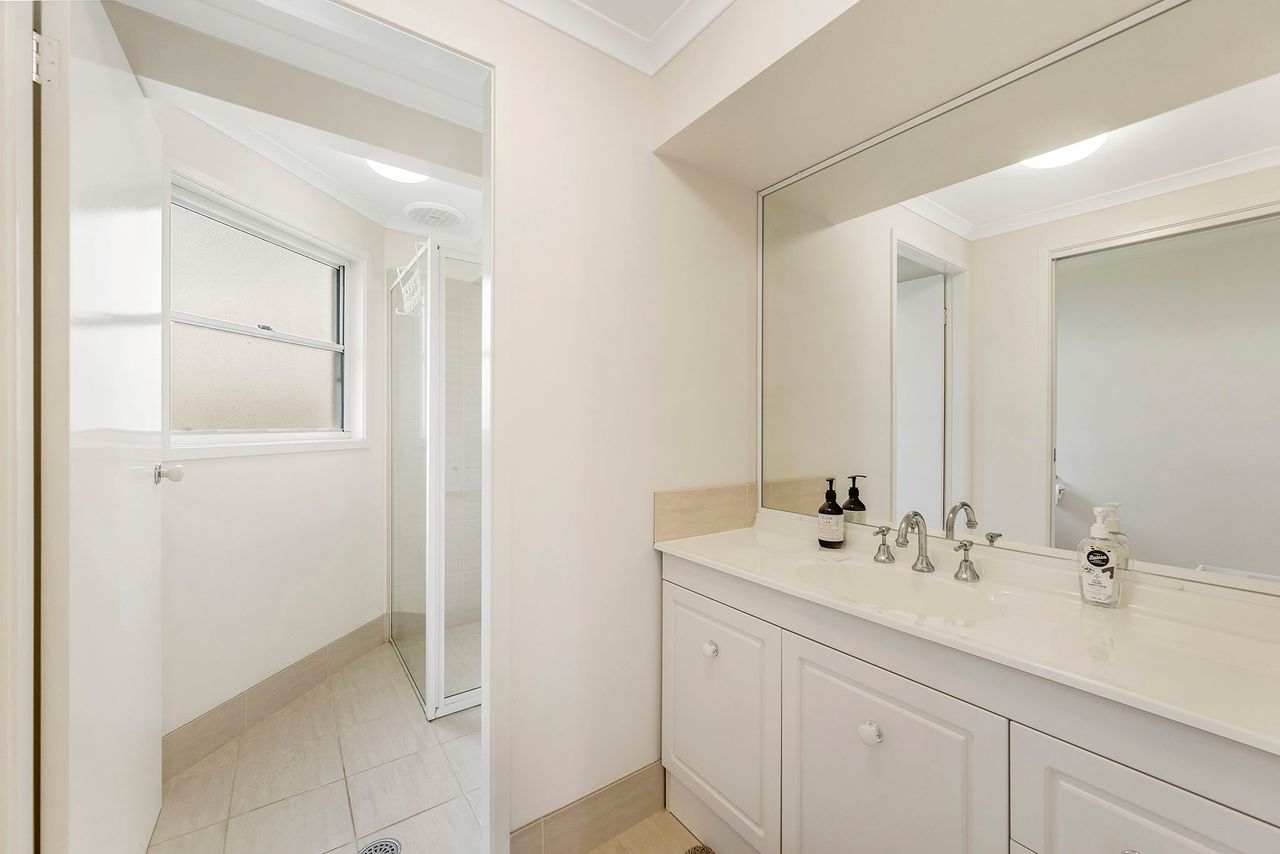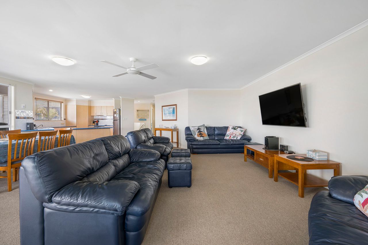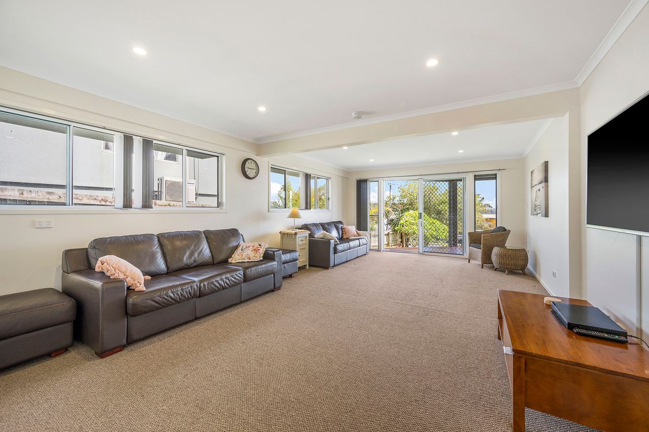 The Master bedroom has a Queen bed & ensuite plus access to rear decking. A Queen bed in the second bedroom & two king single beds in the third. Downstairs offers a second living area with TV/DVD, shady deck area, and an extra bathroom.